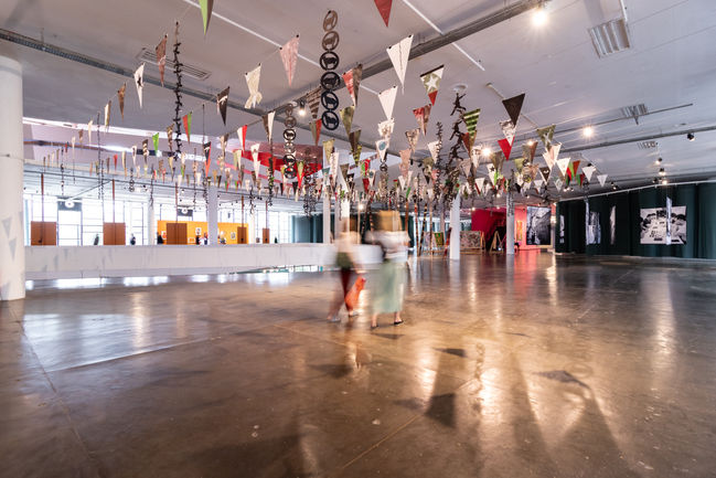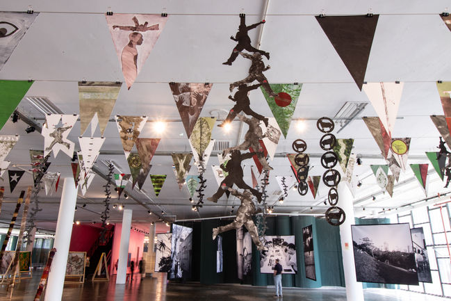 Created for the 36th iteration of the São Paulo Biennale, After the appeal will come the next delivery is inspired by the artist’s childhood memories of listening to cricket commentary, the piece consists of several pennant flags, each carrying a sign or pattern. Recognisable amongst the myriad of drawings is the “appeal gesture”—commonly known as “Howzat”—performed by a fielder (or fielders) towards the umpire during a cricket game. Referring to a crucial decision-making process, an appeal usually symbolises the decisive moment before a batsman is given out or not, and the game can be resumed. Particularly appealing, the piece, beyond its aesthetics, serves as a metaphor whereby parallels can be drawn between aspects of the game and the mechanisms that define and regulate societal interactions, such as unfairness, power dynamics, among others. Additionally, symbols such as human figures and text fragments, characteristic of Cozier’s unique long-term developed artistic and visual language, recur, inscribed primarily on red, green, and black pennant flags—colours that reminisce liberation struggle movements across the African continent and the Middle East.